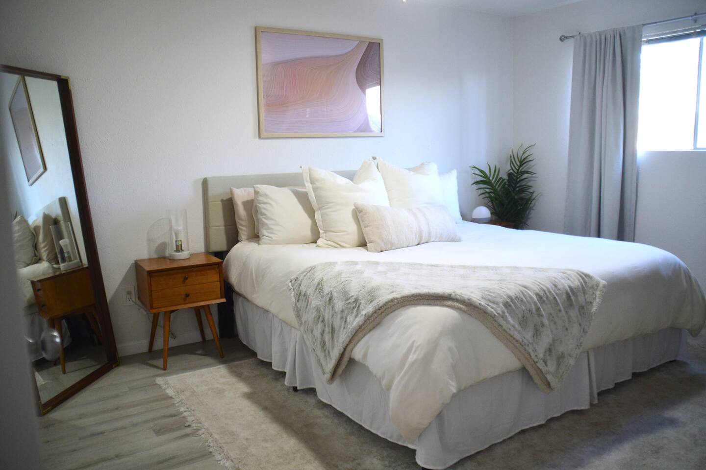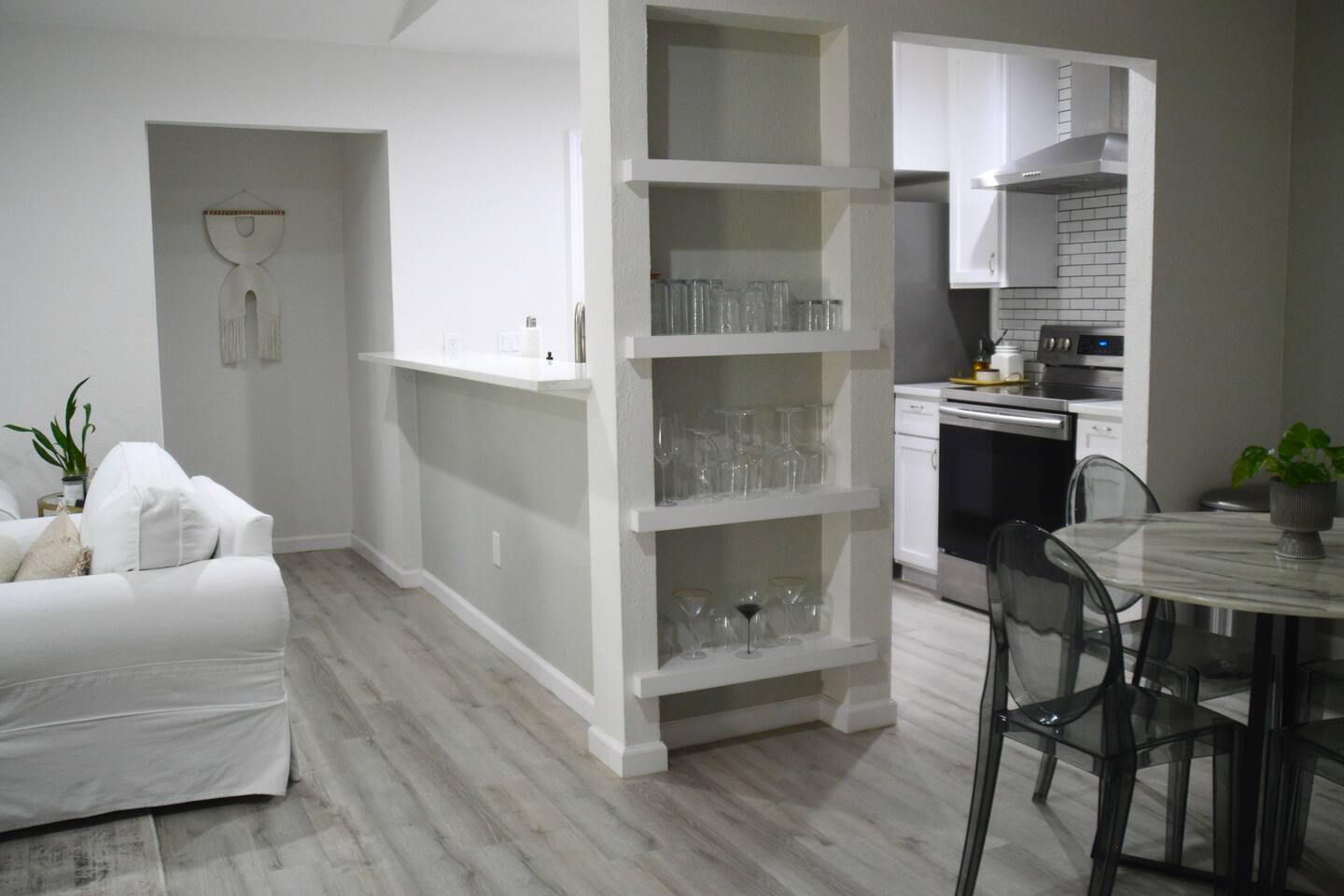 The home is on half of a duplex in quite cul-de-sac in south Austin. You enter into the living room and it flows seamlessly into the kitchen,. From there you can enter into either bedroom, with the master bedroom being in the rear of the home overlooking the garden, and the guest bedroom being in the front of the home.