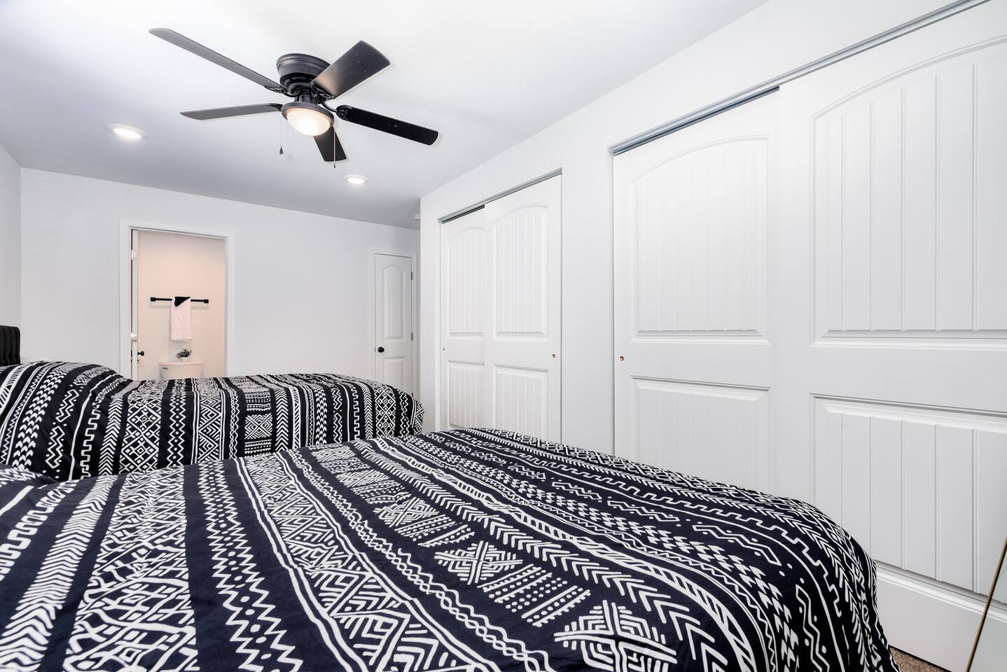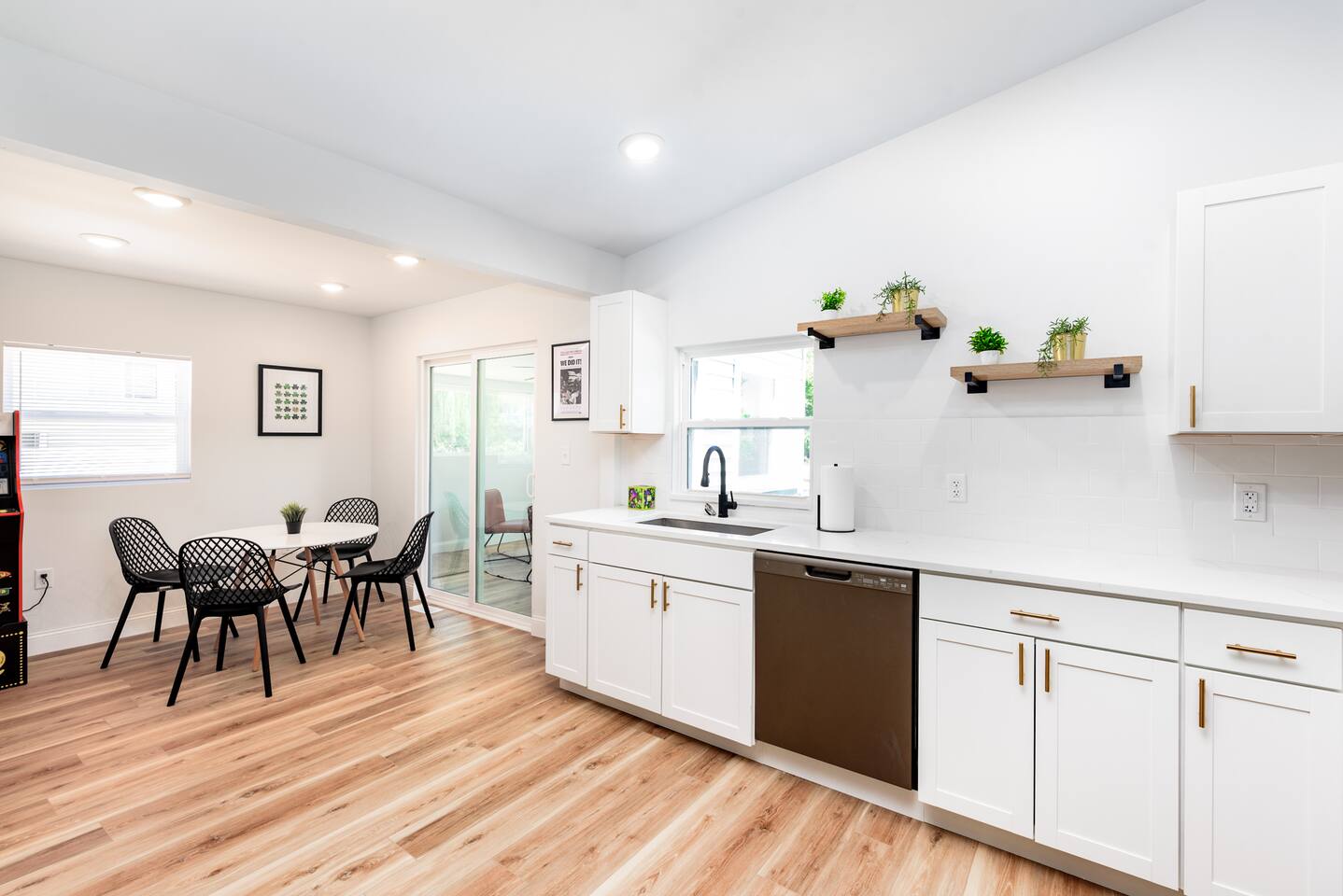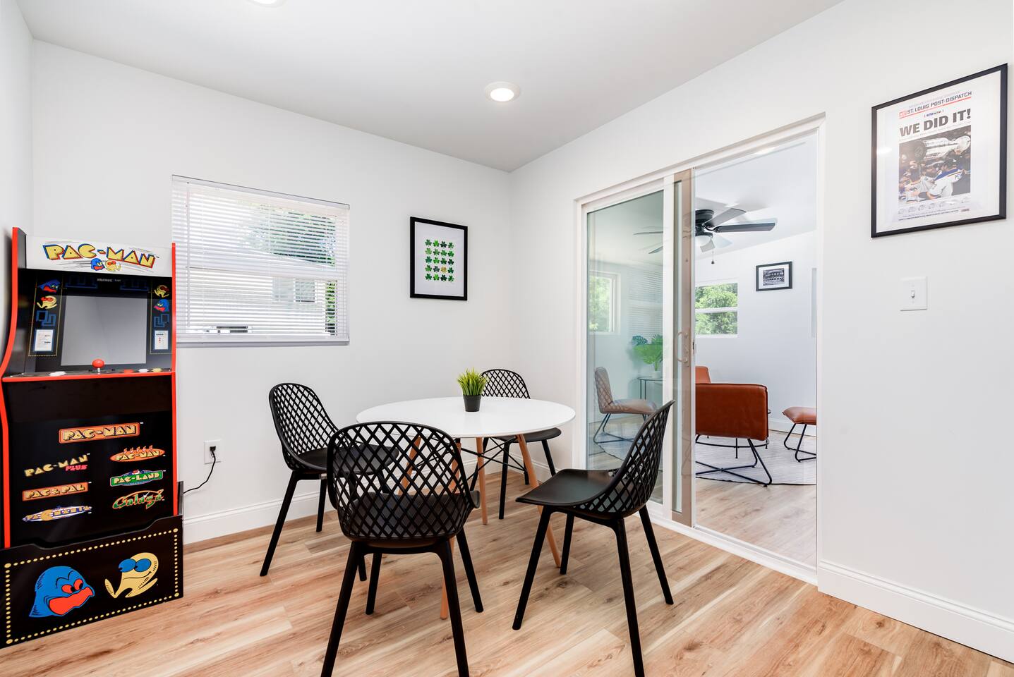 The home is laid out on one floor with a master bedroom on your right with a large closet and private bathroom and right next to it is a bedroom with a queen bed. In the center of the home is the living room with tall, arching ceilings, and ample natural light. On the other side of the living room is a large bedroom with two queen beds and is connected to the second bathroom. The kitchen is on the far end of the home and is open to the dining area where you will find the kitchen table as well as the arcade game. Off the kitchen you will find a bonus all seasons room which makes for a great spot to sit and enjoy your coffee.