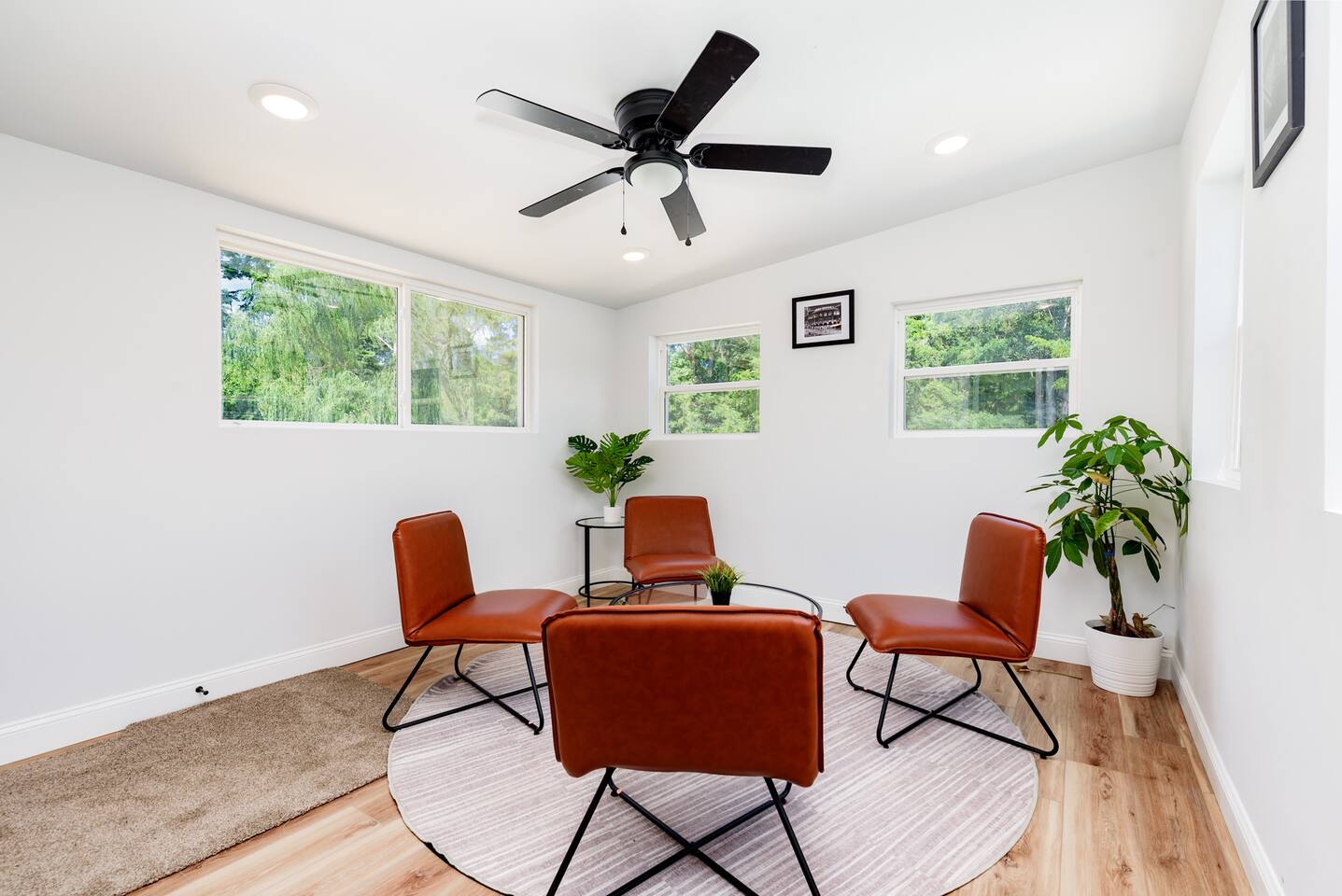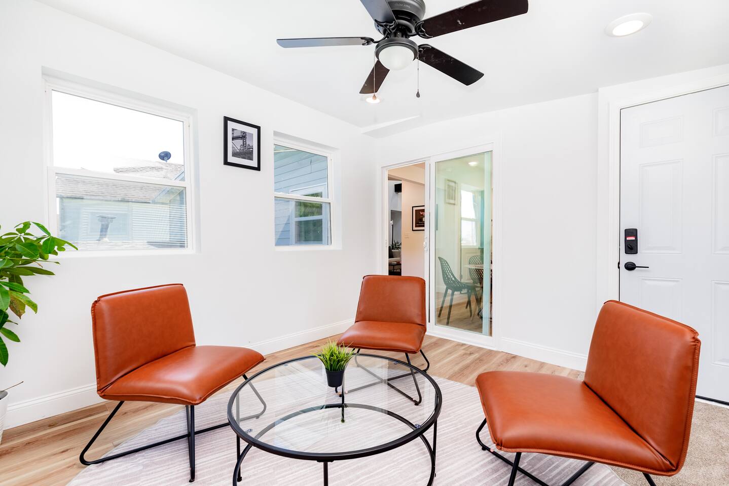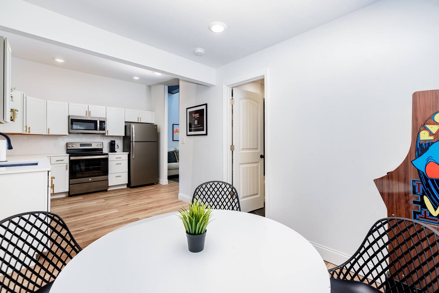 The home is laid out on one floor with a master bedroom on your right with a large closet and private bathroom and right next to it is a bedroom with a queen bed. In the center of the home is the living room with tall, arching ceilings, and ample natural light. On the other side of the living room is a large bedroom with two queen beds and is connected to the second bathroom. The kitchen is on the far end of the home and is open to the dining area where you will find the kitchen table as well as the arcade game. Off the kitchen you will find a bonus all seasons room which makes for a great spot to sit and enjoy your coffee.